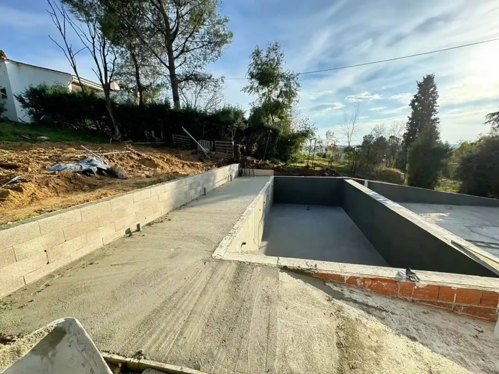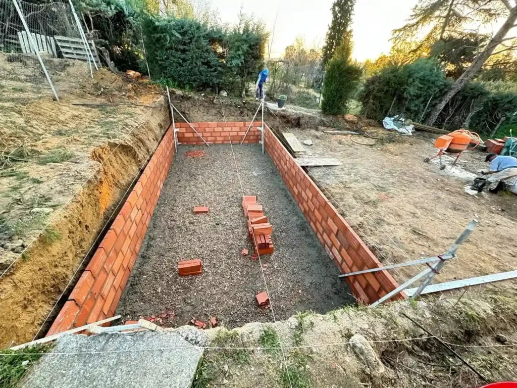 Se construye la estructura de la piscina, generalmente en hormigón proyectado (gunite), que permite personalizar completamente su forma. Alrededor del borde superior se instala una canaleta perimetral o en un solo lado, dependiendo del diseño.