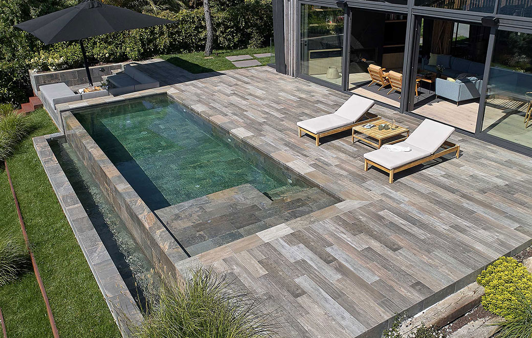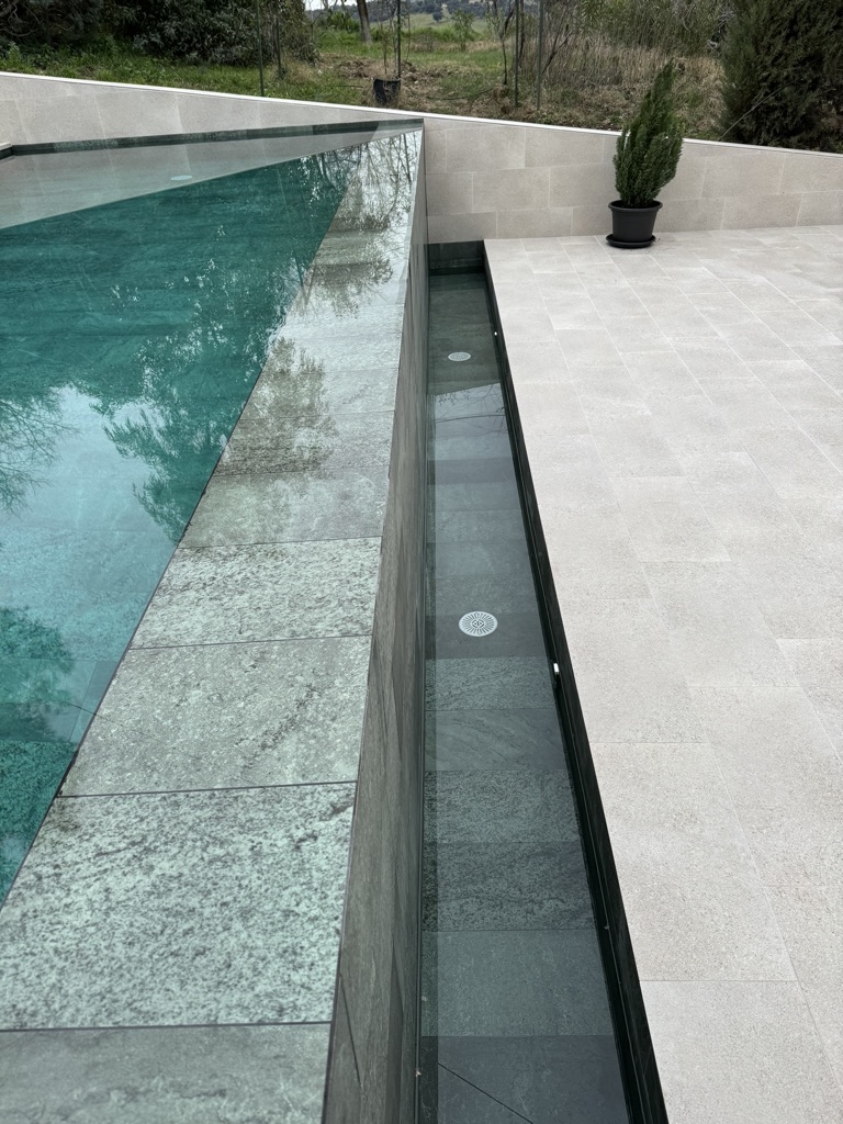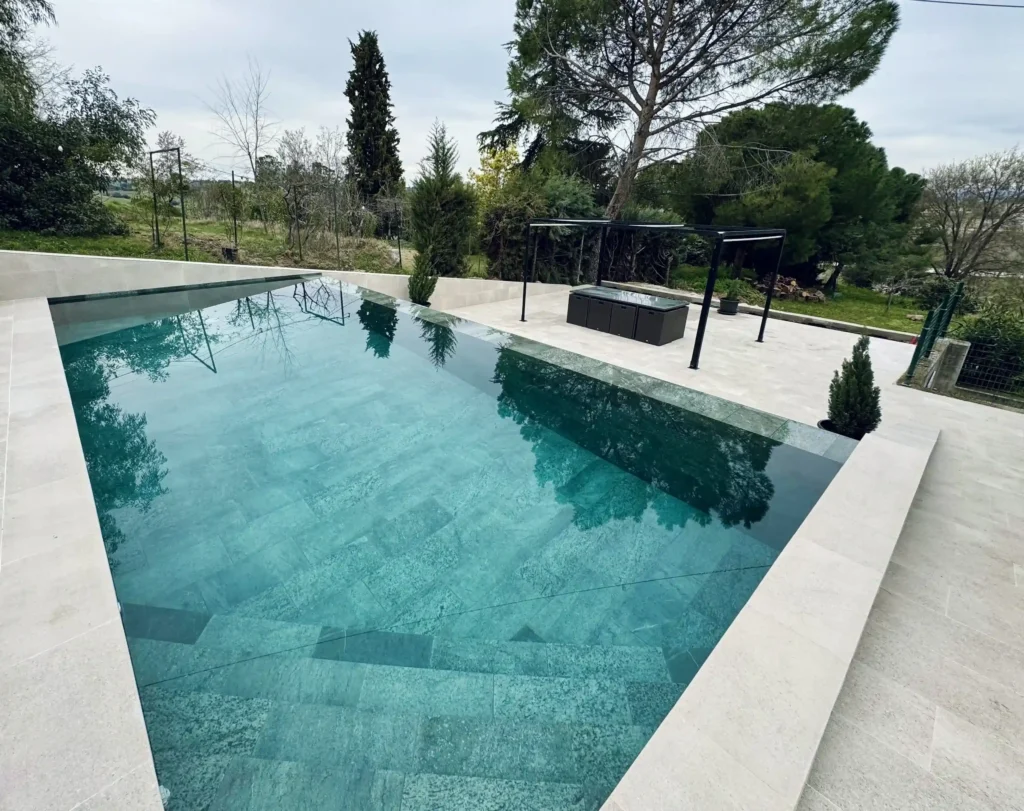 El acabado de una piscina infinita es clave para su estética. Se pueden utilizar materiales como gresite, porcelánico o piedra natural para potenciar el efecto visual.