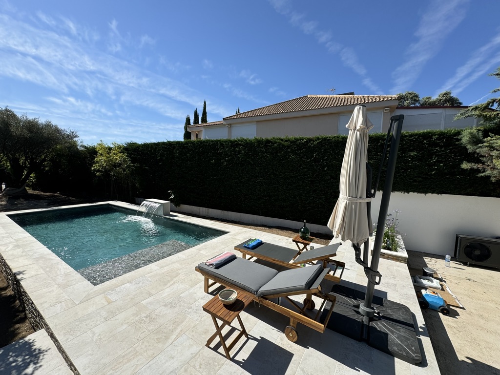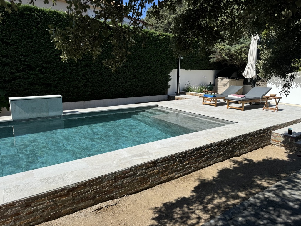 El terreno disponía de una amplia parcela de 600 m², lo que permitió diseñar una piscina de 8 x 4 m con espacio suficiente para integrar una cascada y respetar el entorno paisajístico.