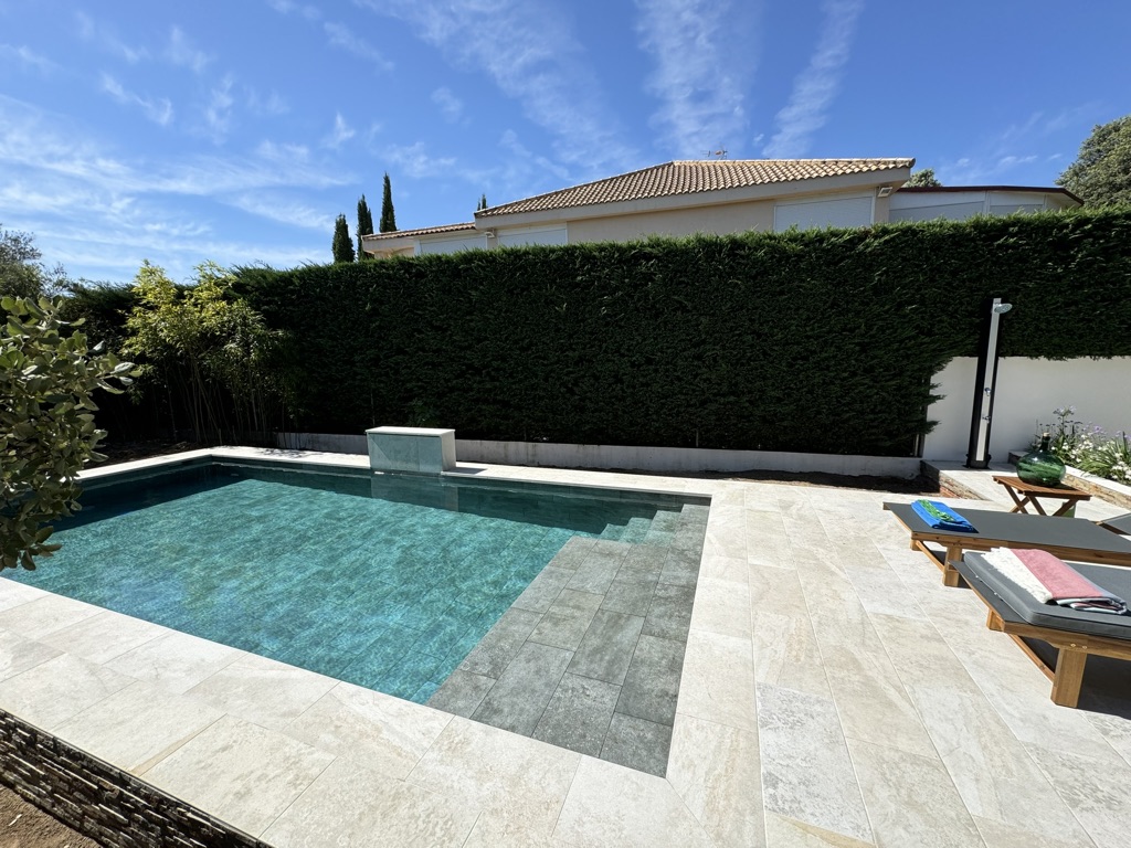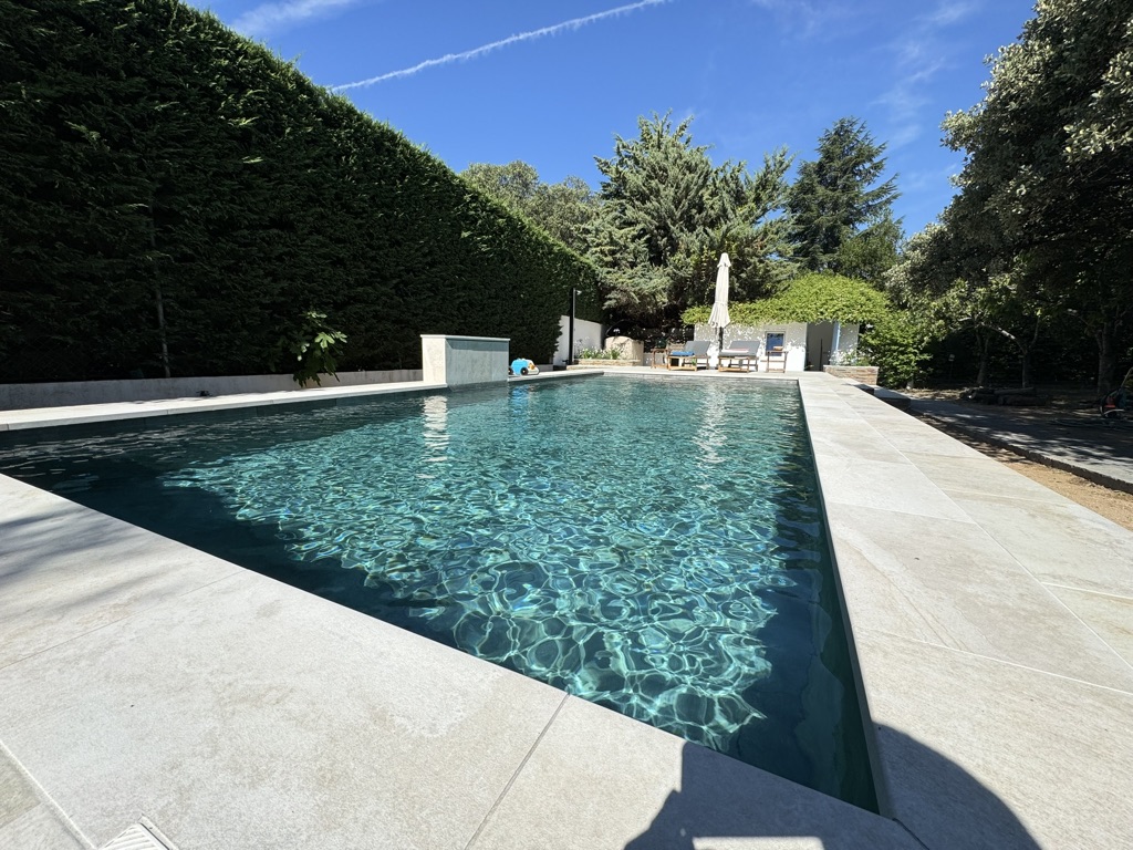 Una piscina que integra diseño y naturaleza con una cascada a medida y porcelánico especial.