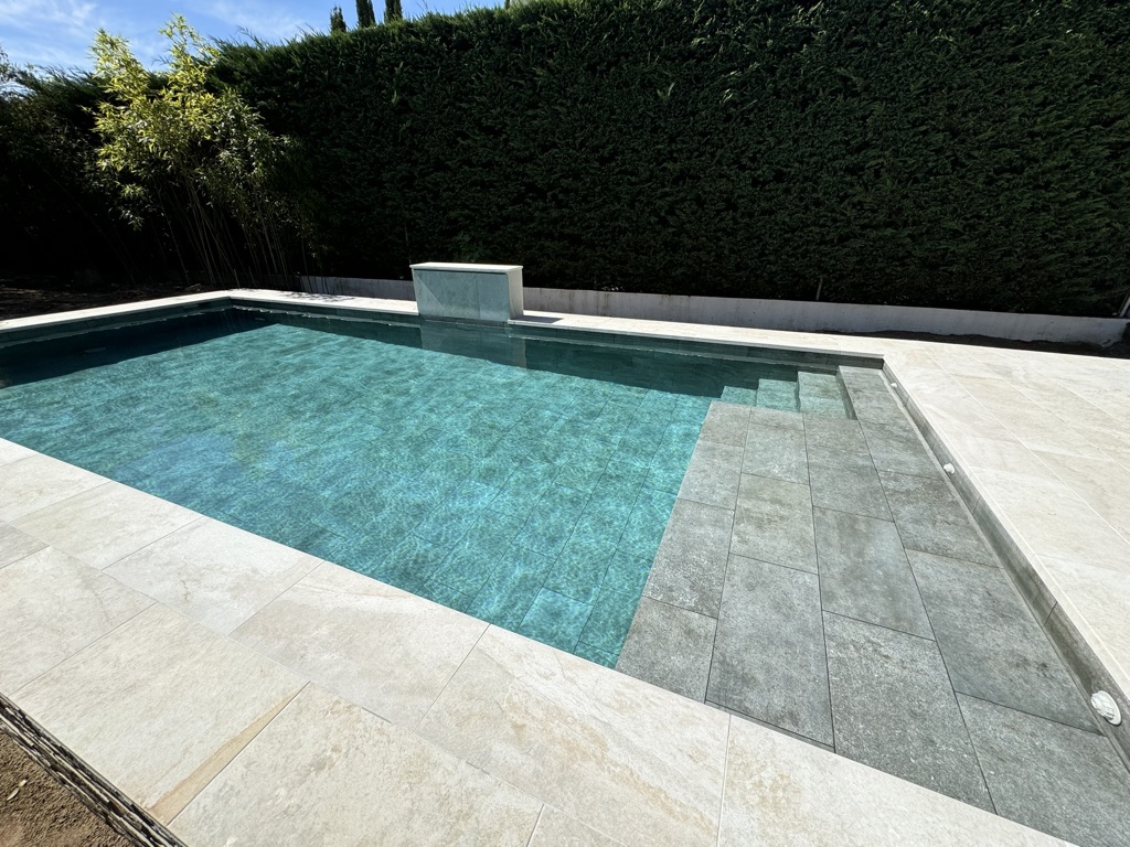 El principal reto fue dar respuesta al deseo del cliente de que la piscina no fuera un elemento aislado, sino que se integrara de manera natural con el jardín existente. La elección de los porcelánicos en dos tonos y el diseño del entorno buscaban precisamente esa armonía con la vegetación y los elementos paisajísticos. La cascada, aunque no protagonista, se diseñó a medida como un complemento que aportara movimiento y frescura al conjunto.