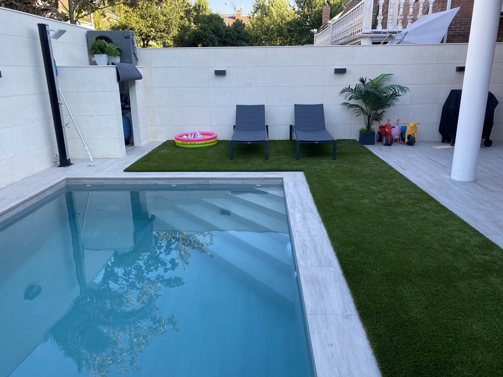 En este proyecto se instalaron una cascada con luz LED multicolor y una bomba de calor para climatización, lo que convierte la piscina en un espacio disfrutable durante todo el año. Además se incorporaron ducha solar y césped artificial.