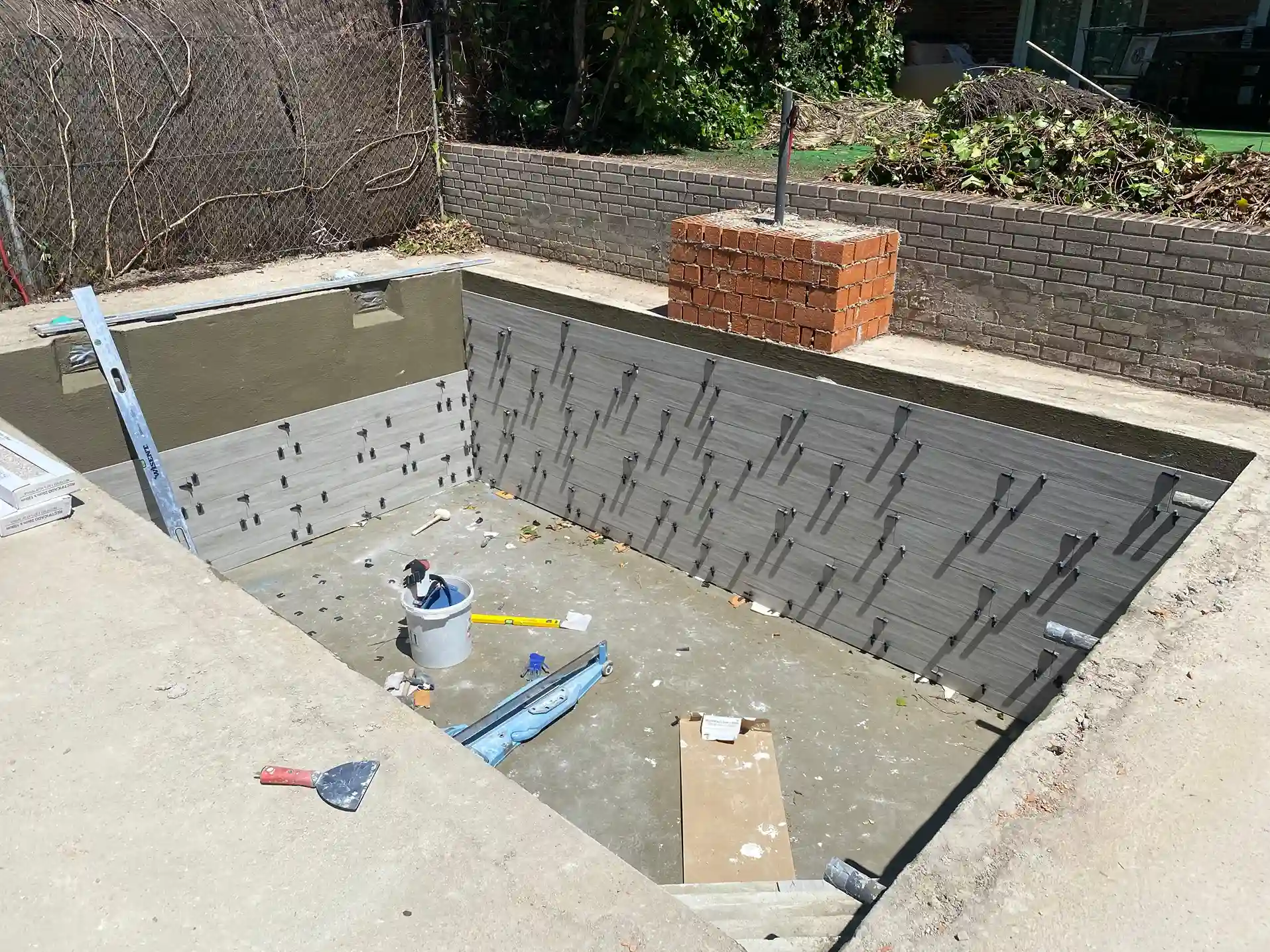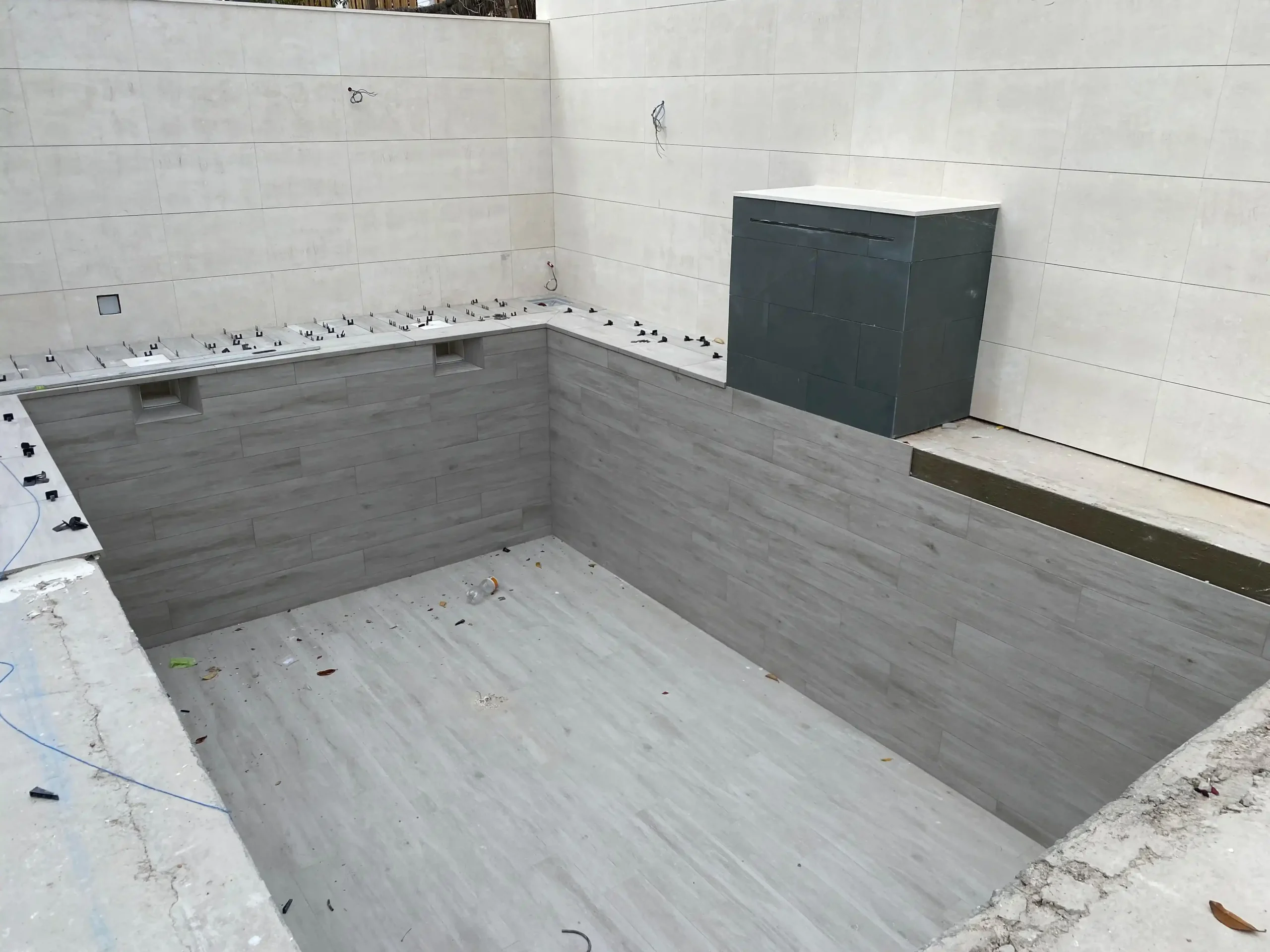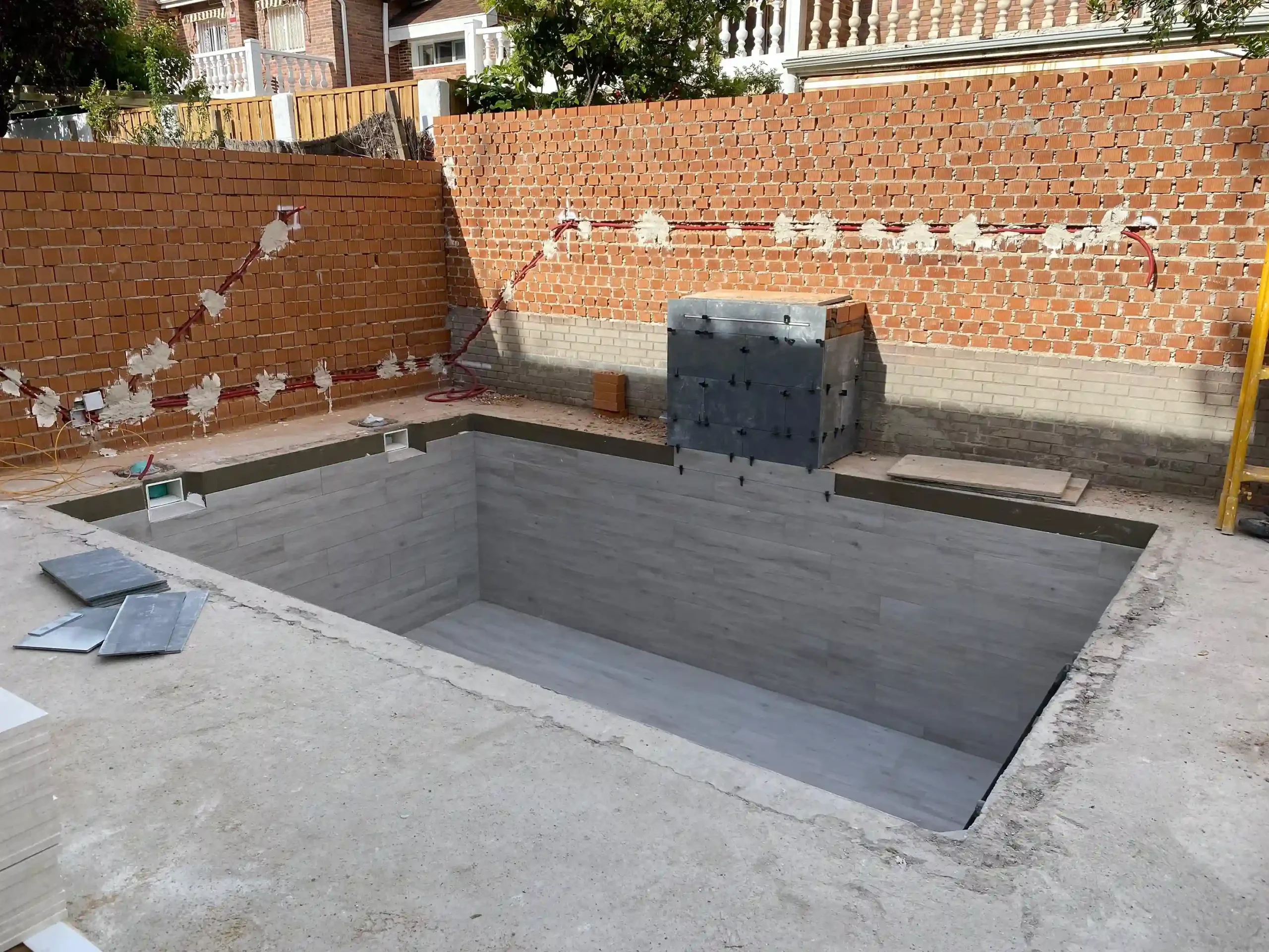 Se trata de una piscina de obra en hormigón proyectado, con revestimiento en porcelánico imitación madera, color ceniza. Este material garantiza durabilidad, fácil mantenimiento y un diseño moderno que se integra perfectamente con el entorno.