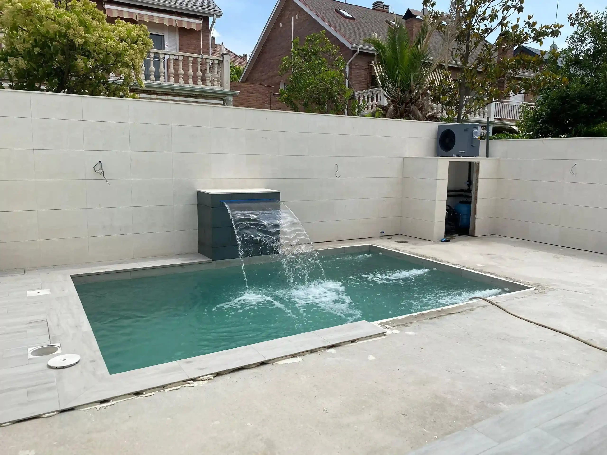 Un detalle destacado es la cascada con luz LED multicolor, que se convierte en protagonista durante las noches. Además, se instaló una bomba de calor, cumpliendo con el deseo del cliente de poder disfrutar de la piscina en cualquier estación del año.