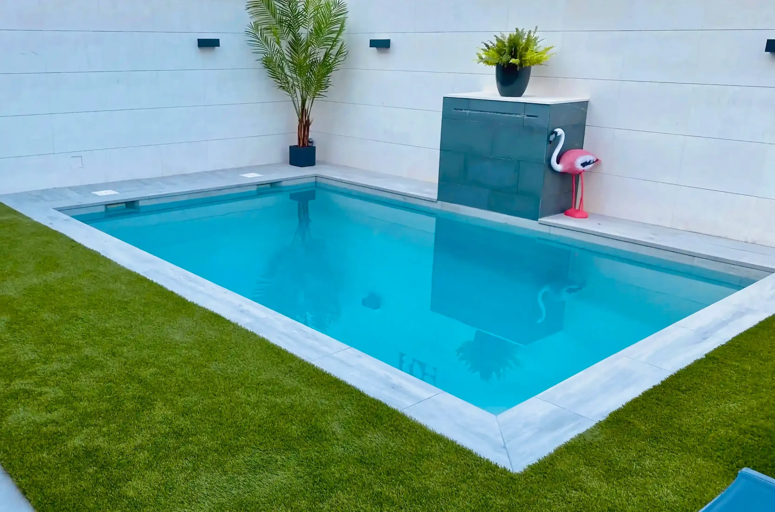 La finca, de 150 m², contaba con el espacio justo para integrar una piscina moderna y funcional. En 2022, construimos esta piscina de 5x3,5 m, cuidando tanto la estética como la practicidad. El uso de porcelánico imitación madera en color ceniza aportó un acabado cálido, elegante y resistente.