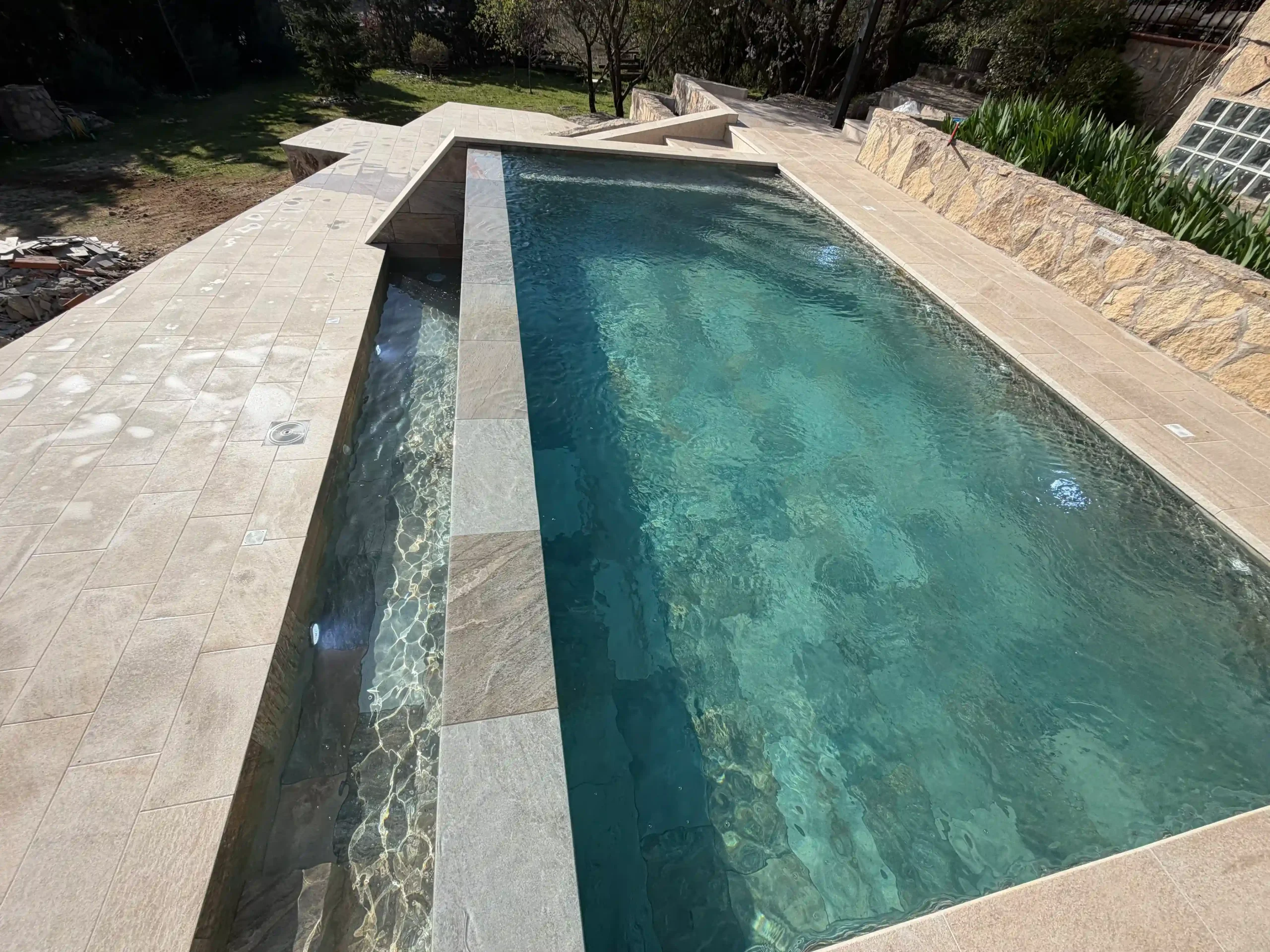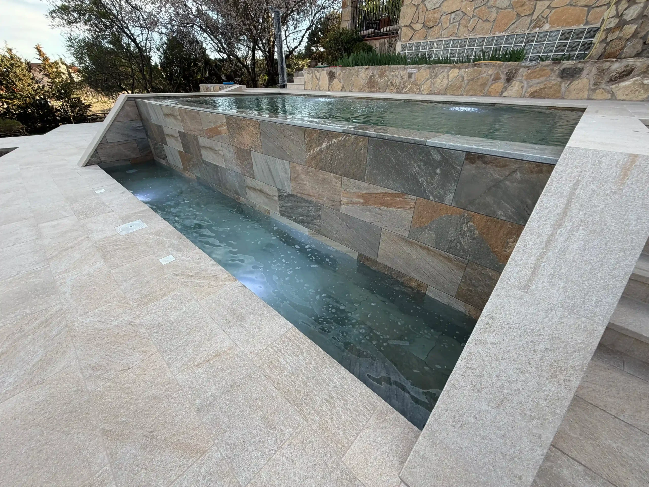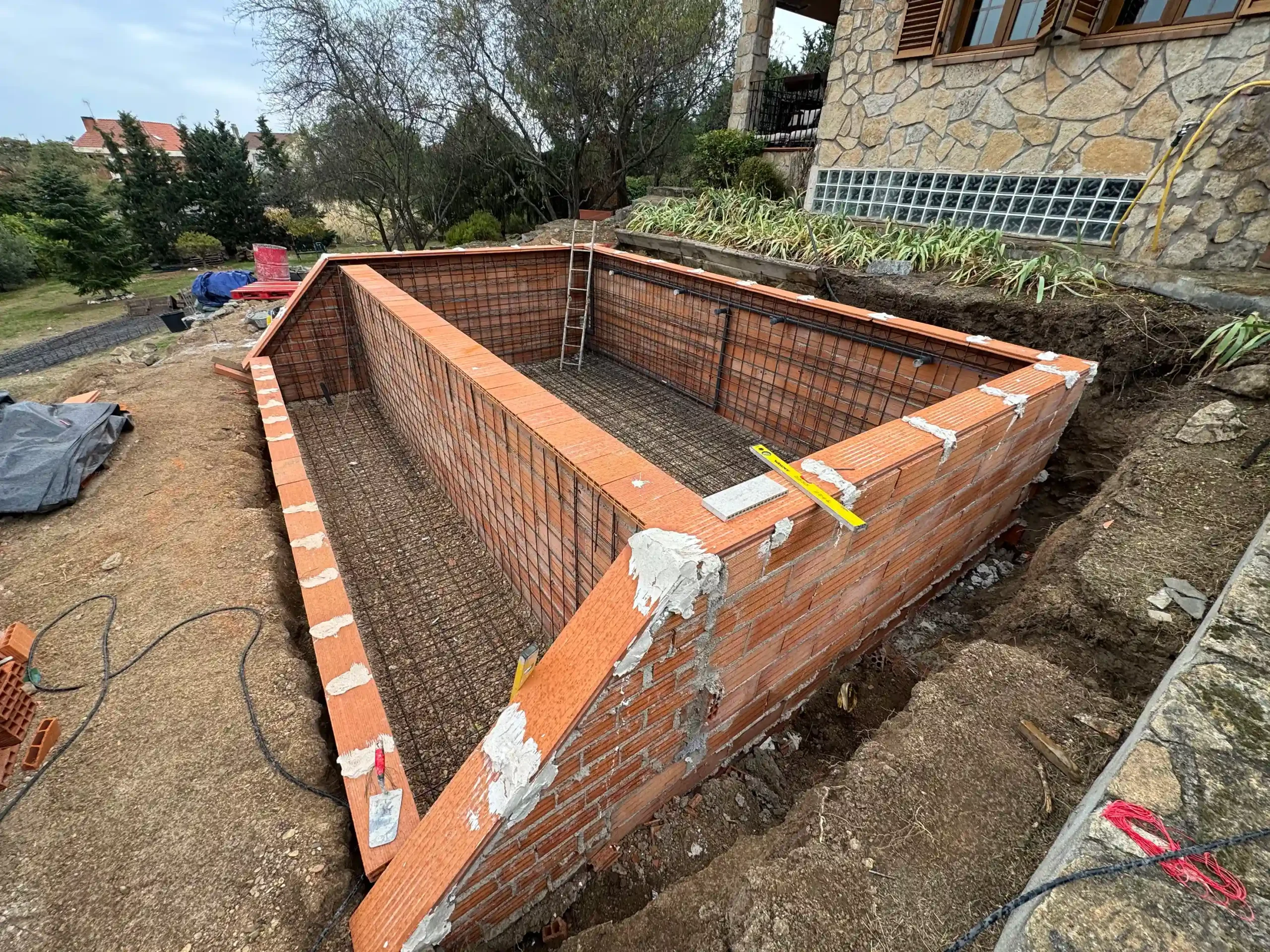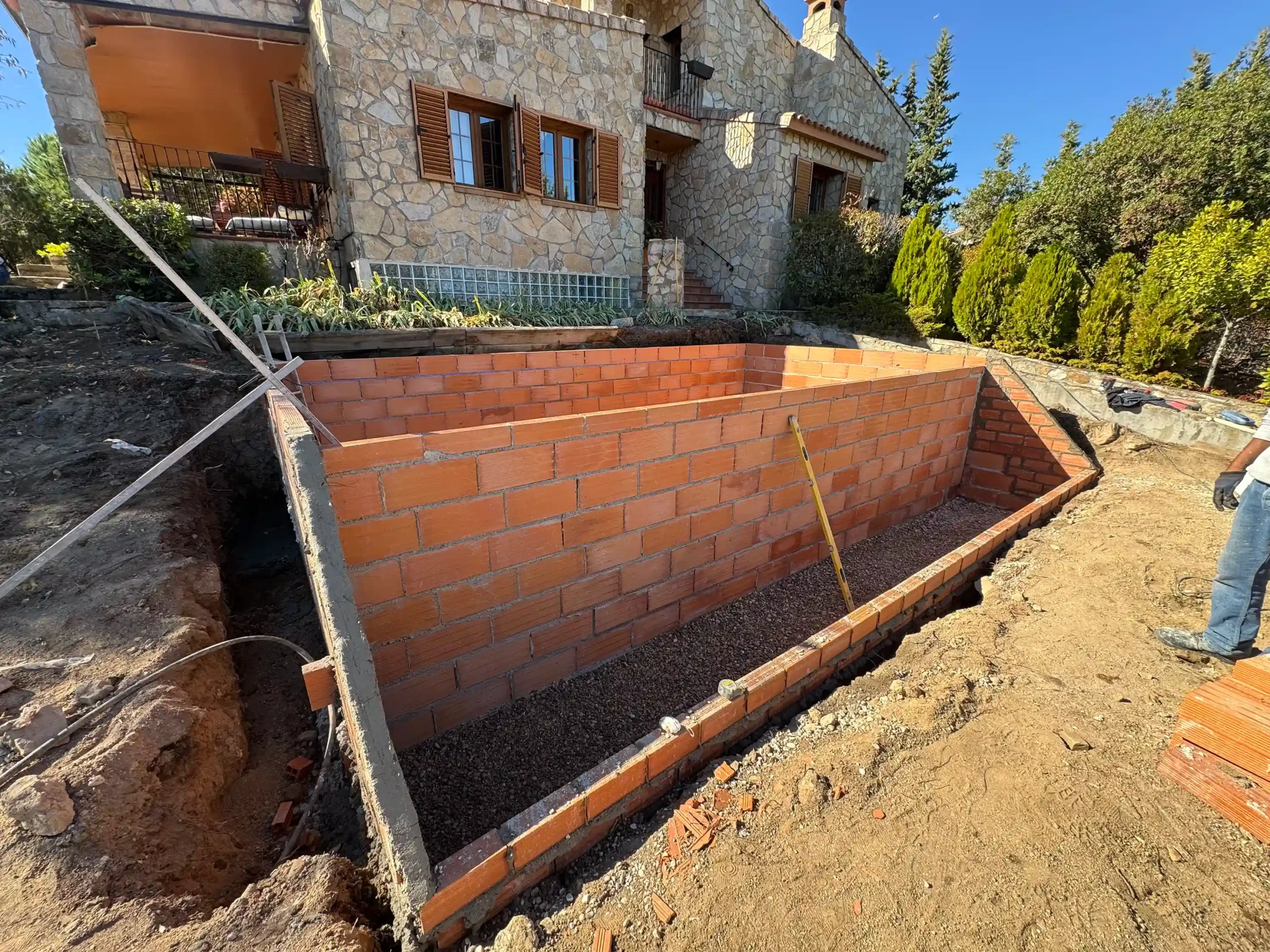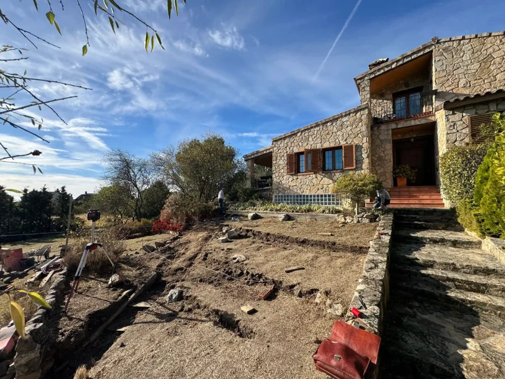 Todo empieza con un replanteo técnico preciso, adaptado a la topografía real de la parcela. No se trata solo de marcar una piscina en el terreno, sino de estudiar cotas, visuales y encajes con la vivienda. La excavación se ejecuta de forma estratégica, teniendo en cuenta drenajes, estabilidad del terreno y la correcta implantación del vaso y del sistema infinity. El mayor reto fue aprovechar la pendiente natural del terreno para convertirla en una ventaja, integrando la piscina en el conjunto arquitectónico y generando continuidad visual con el entorno.