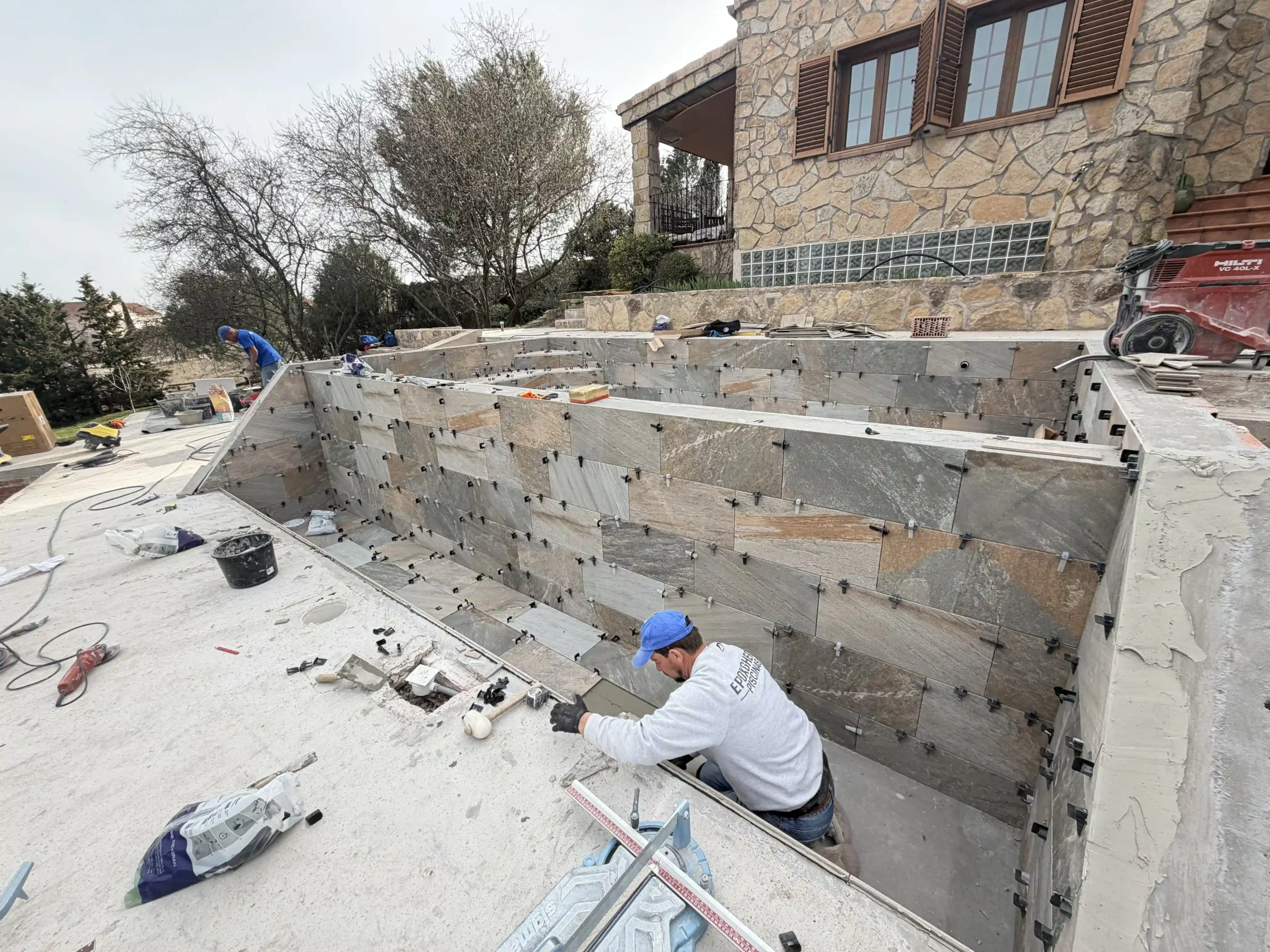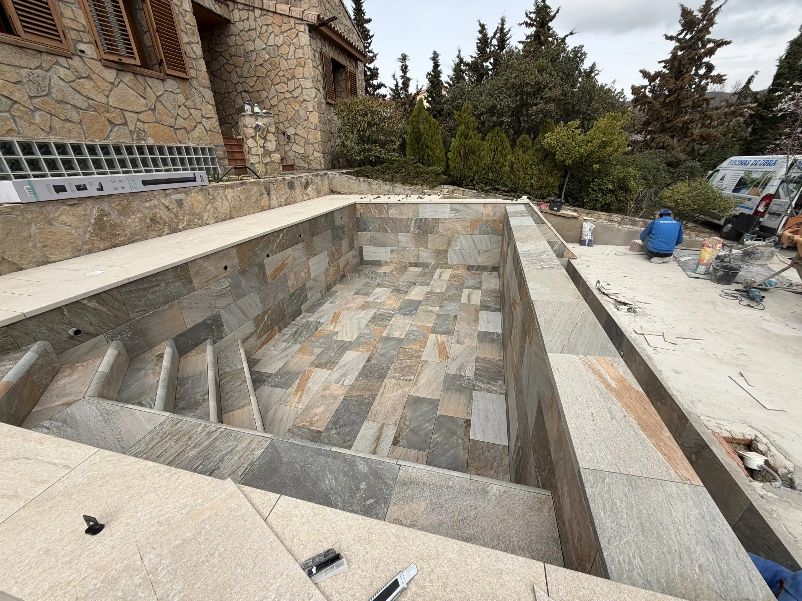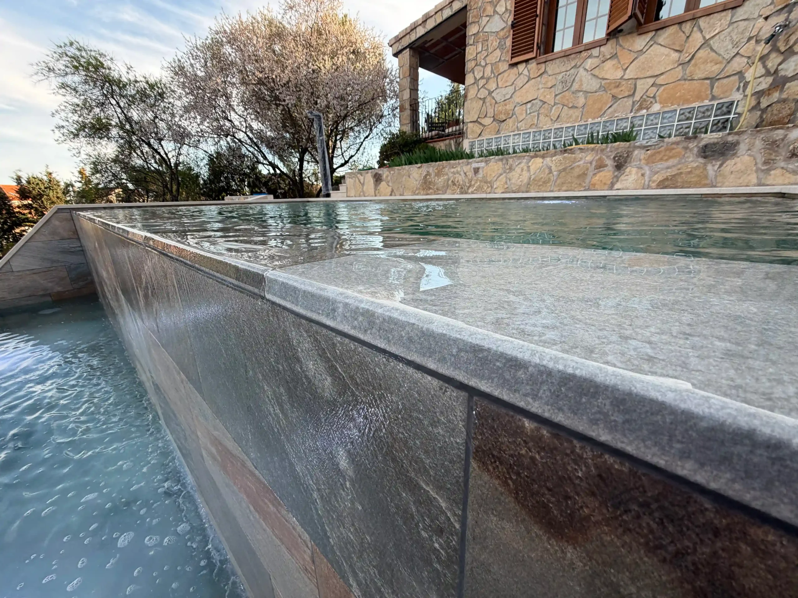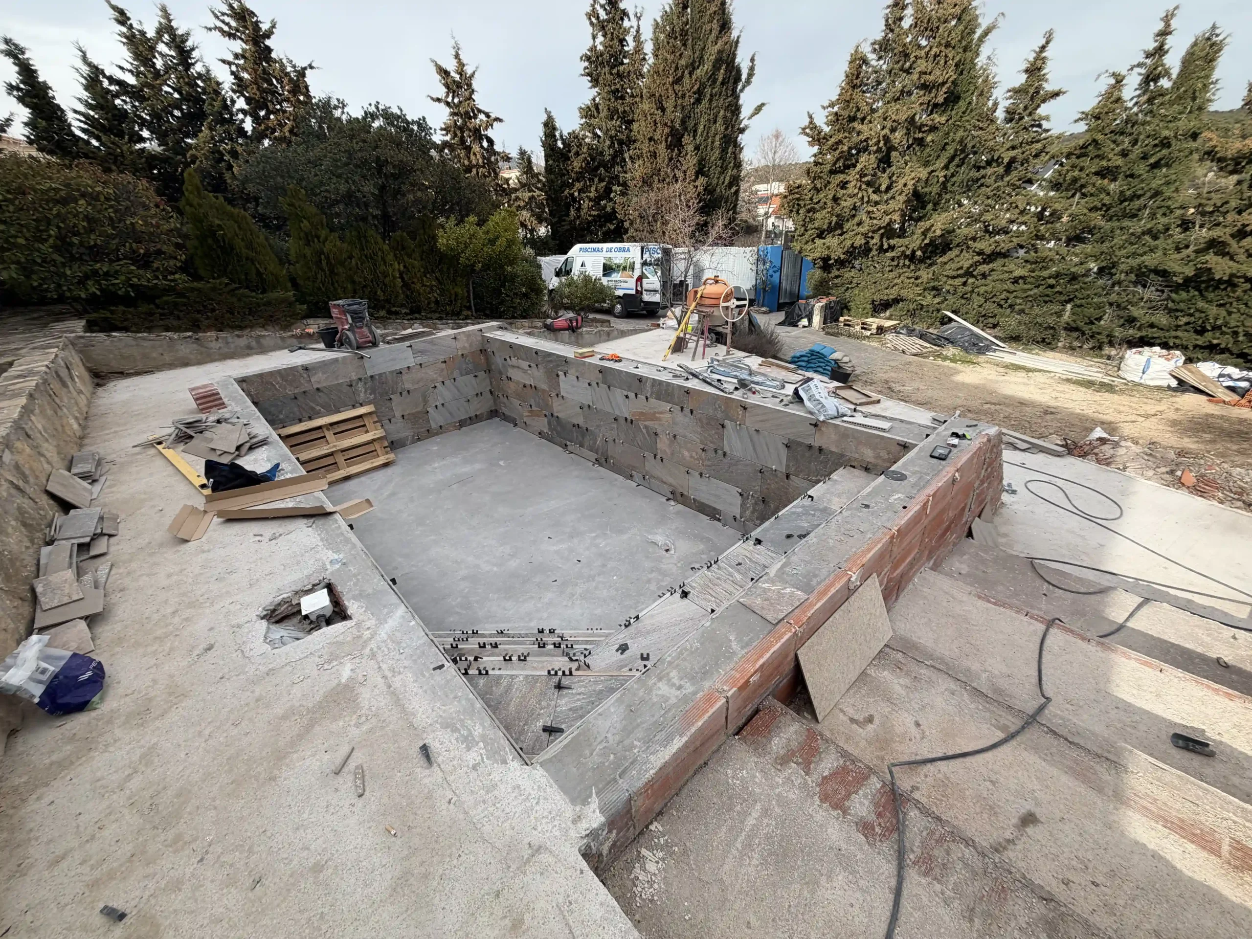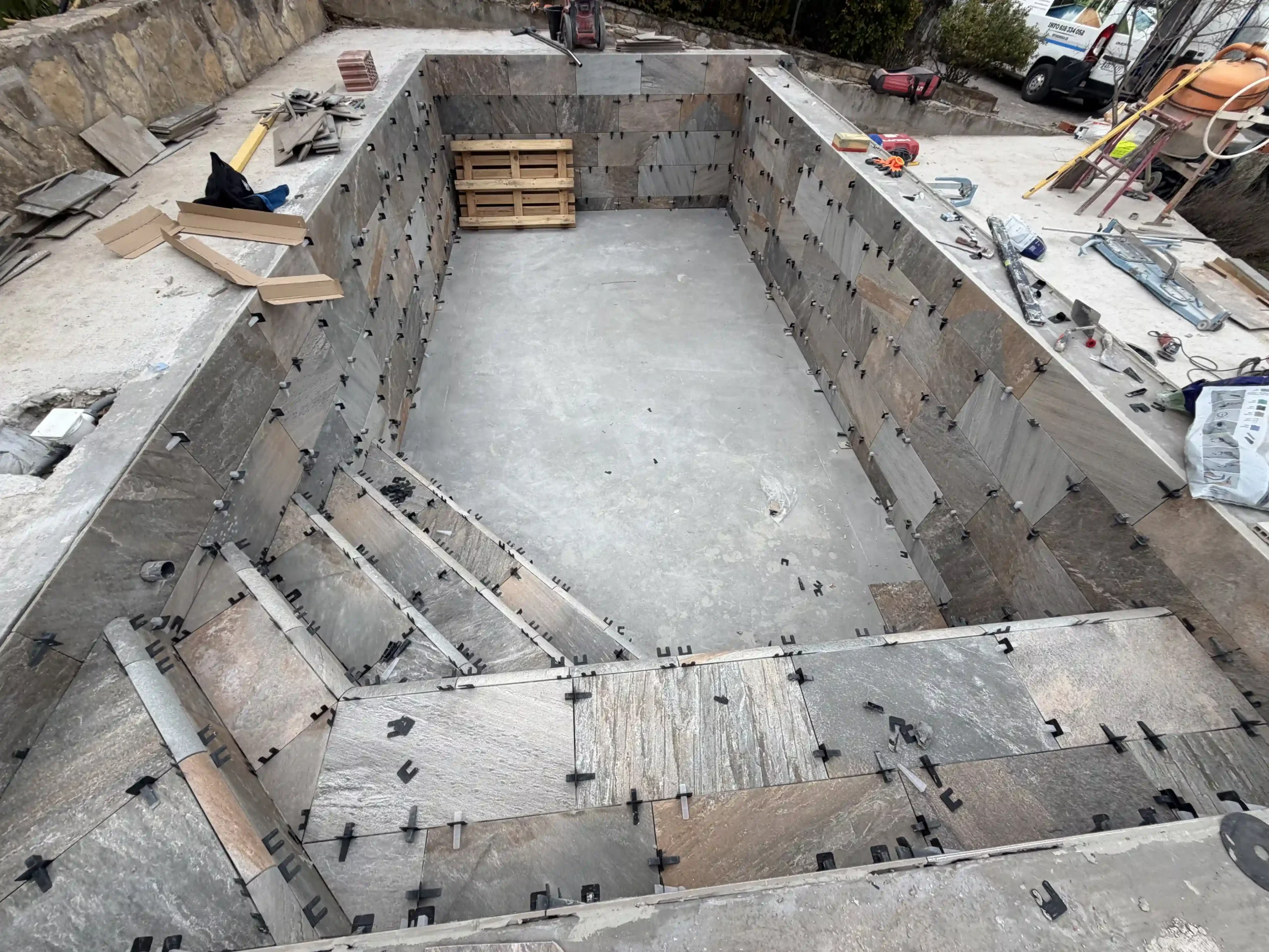 Todo empieza con un replanteo técnico preciso, adaptado a la topografía real de la parcela. No se trata solo de marcar una piscina en el terreno, sino de estudiar cotas, visuales y encajes con la vivienda. La excavación se ejecuta de forma estratégica, teniendo en cuenta drenajes, estabilidad del terreno y la correcta implantación del vaso y del sistema infinity. El mayor reto fue aprovechar la pendiente natural del terreno para convertirla en una ventaja, integrando la piscina en el conjunto arquitectónico y generando continuidad visual con el entorno.