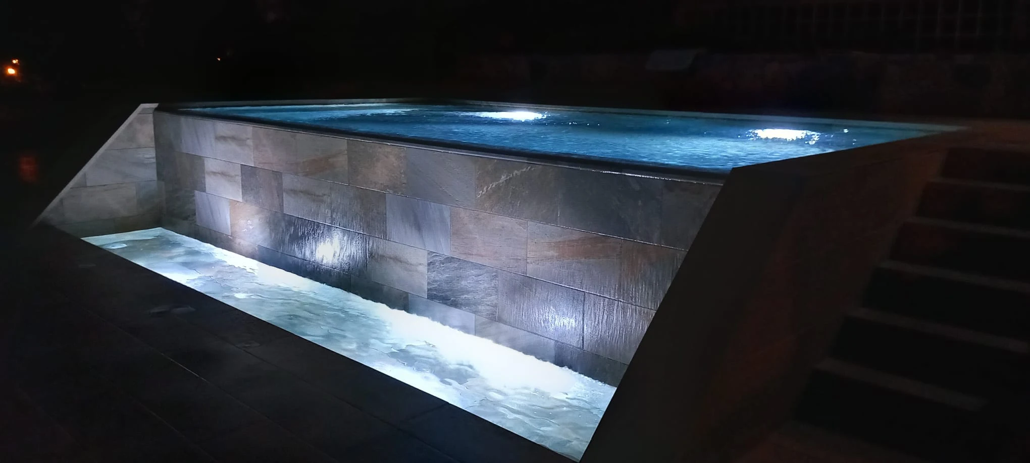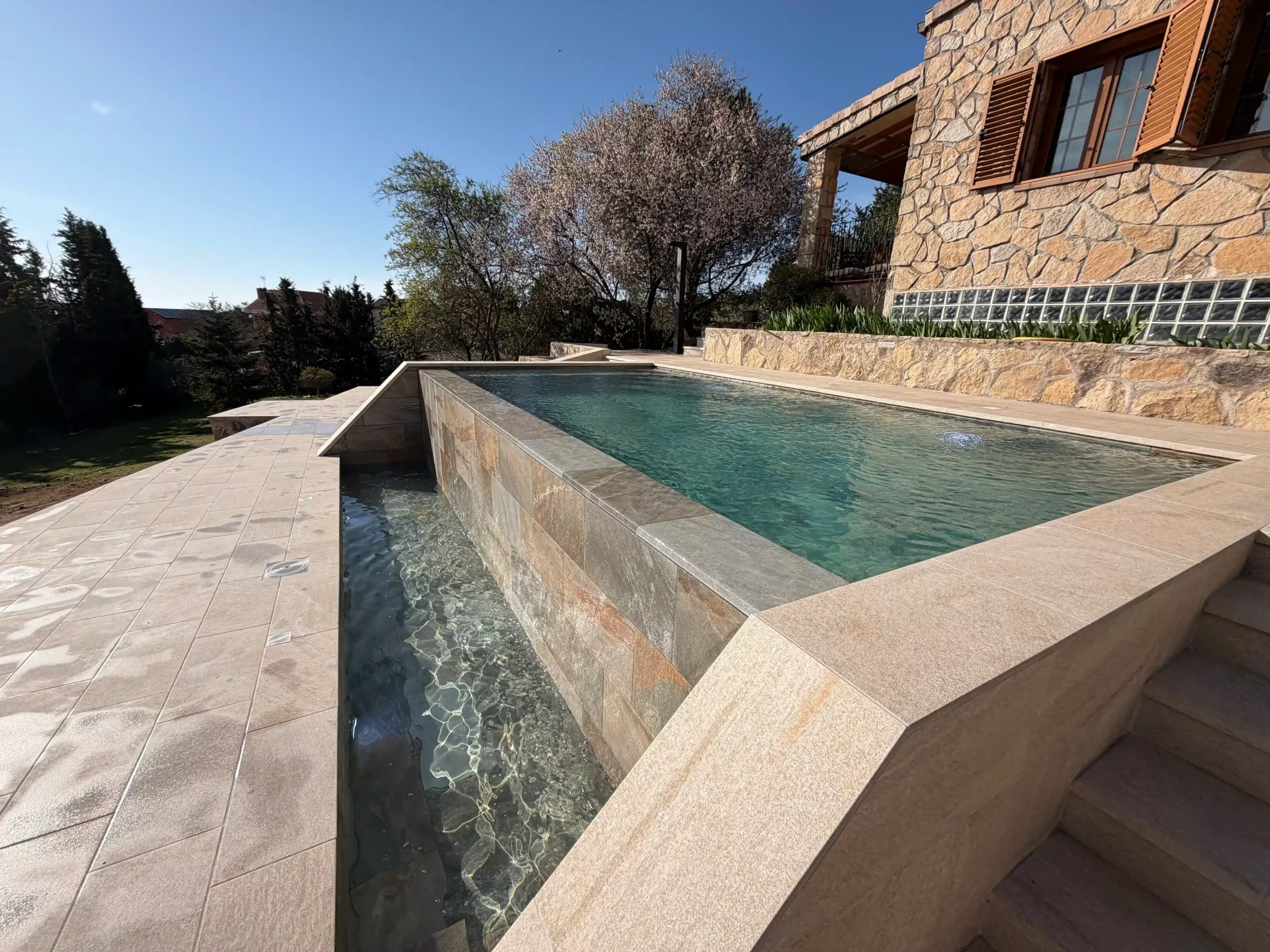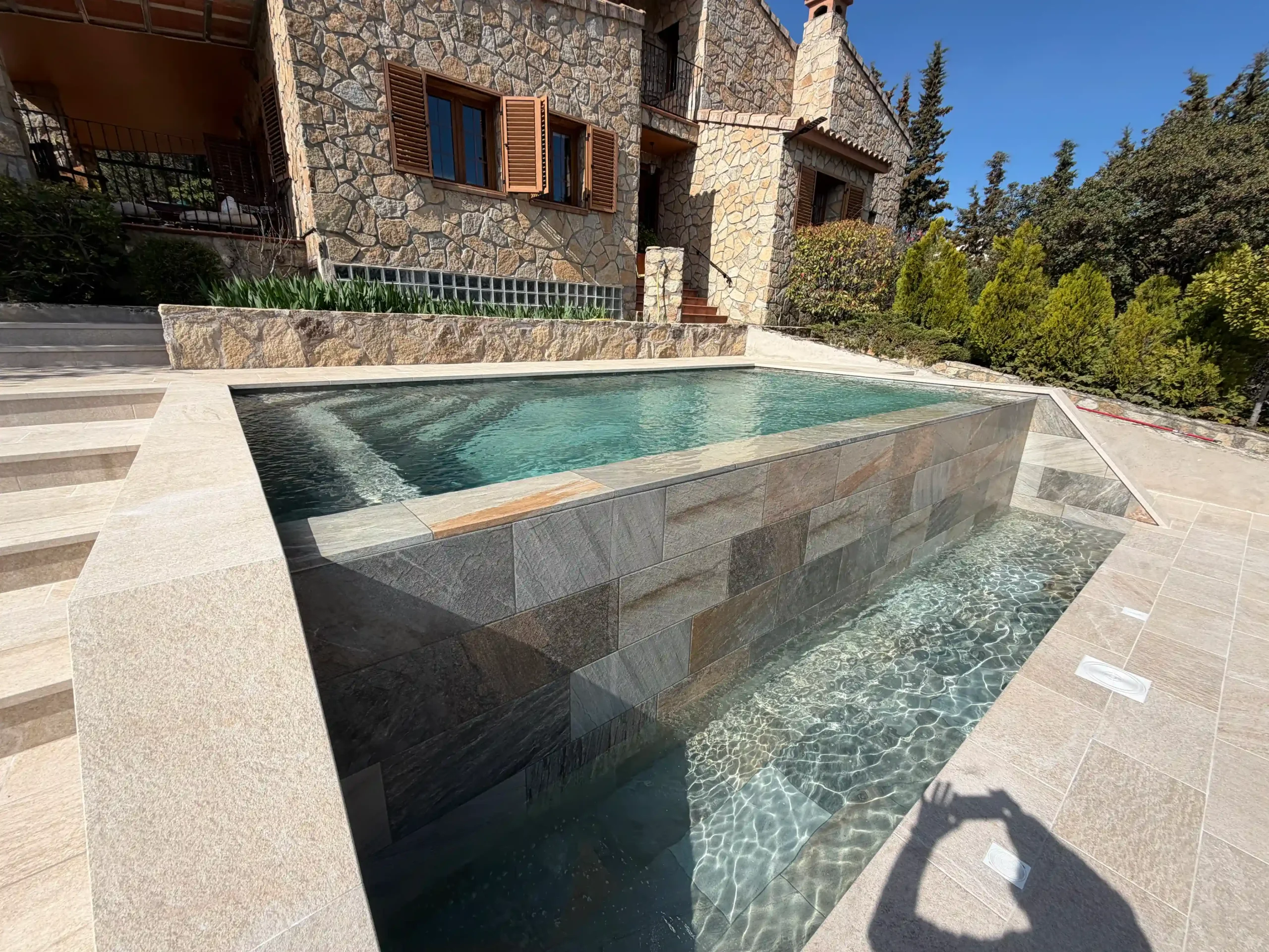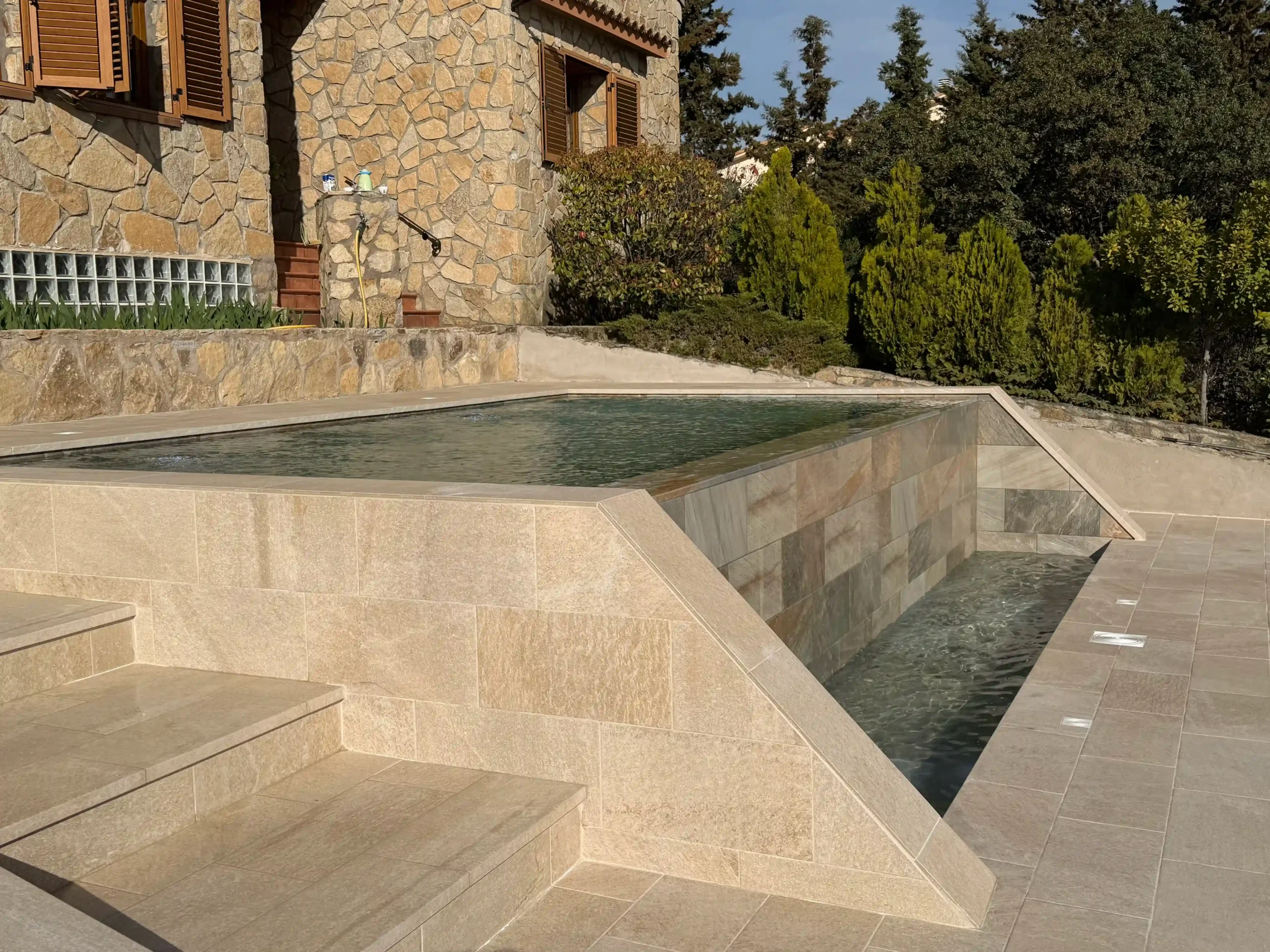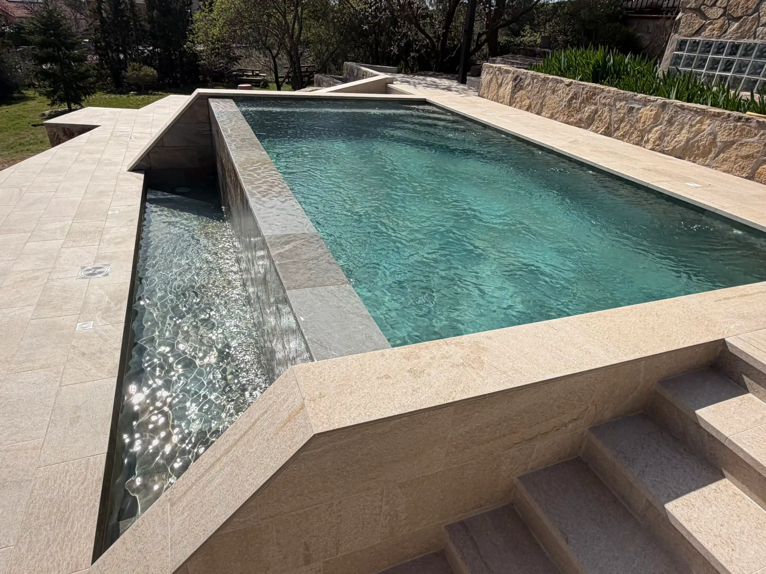 La piscina incorpora escaleras de obra integradas y un banco interior, diseñados para aportar comodidad y crear zonas de descanso dentro del propio vaso. Sistema de depuración adaptado a piscina infinita; ducha solar integrada en el entorno; iluminación tanto en el vaso principal como en el vaso de compensación.