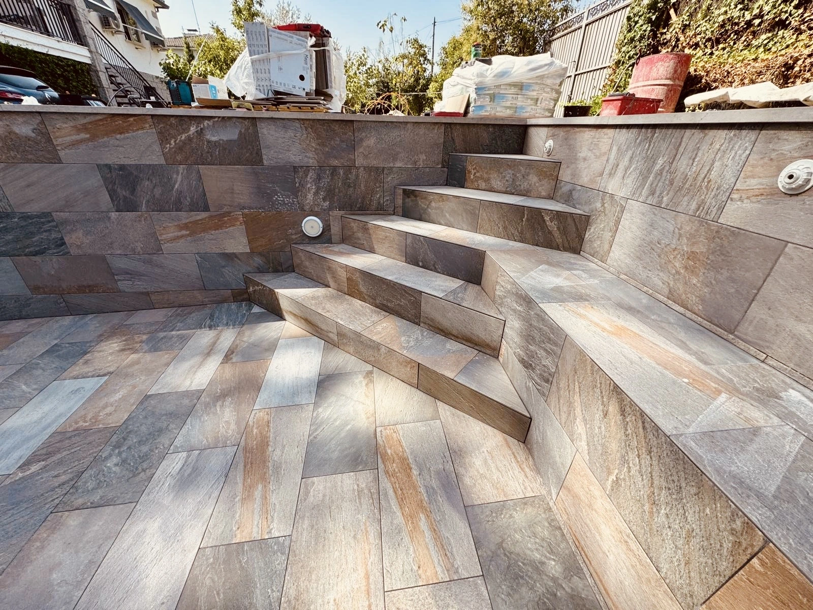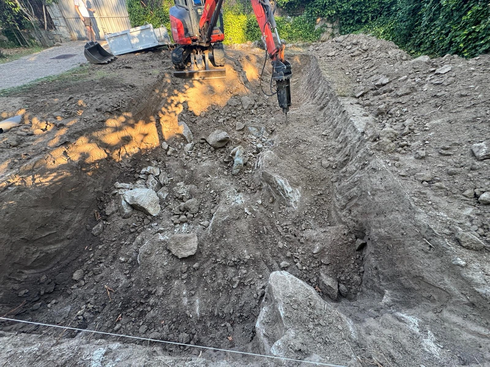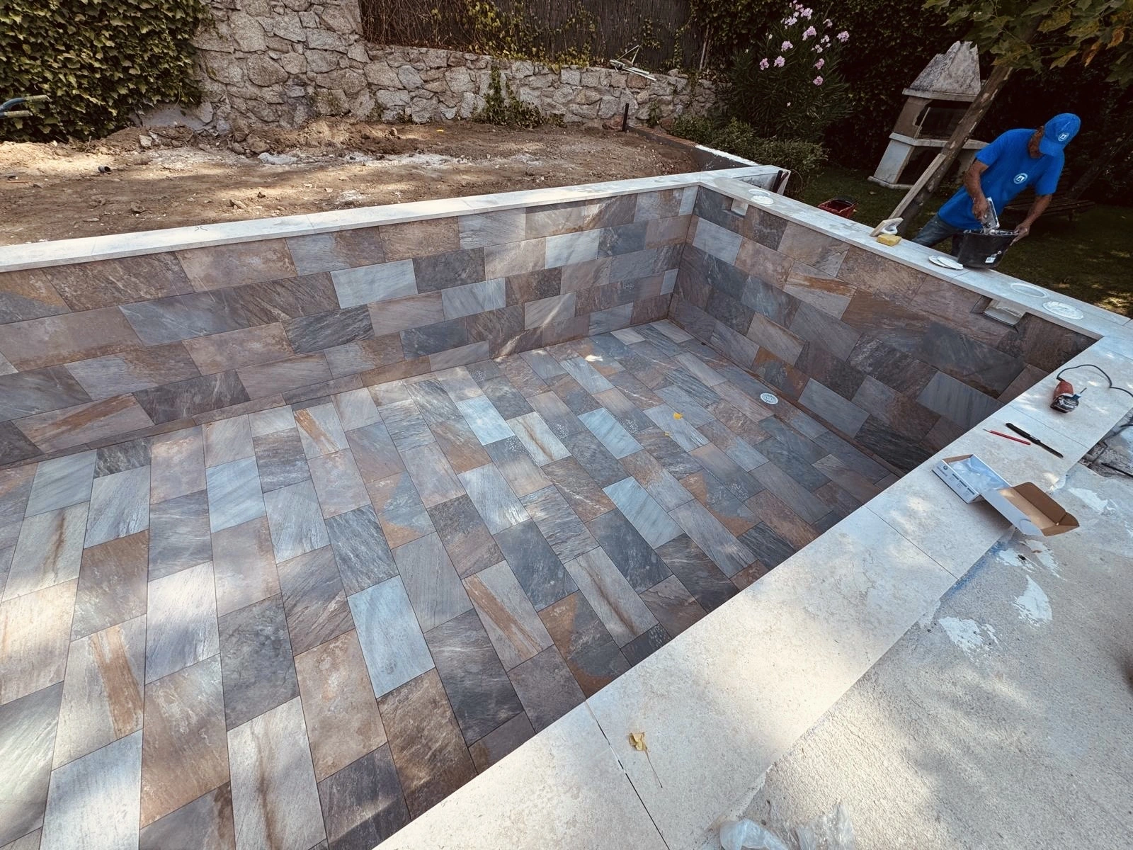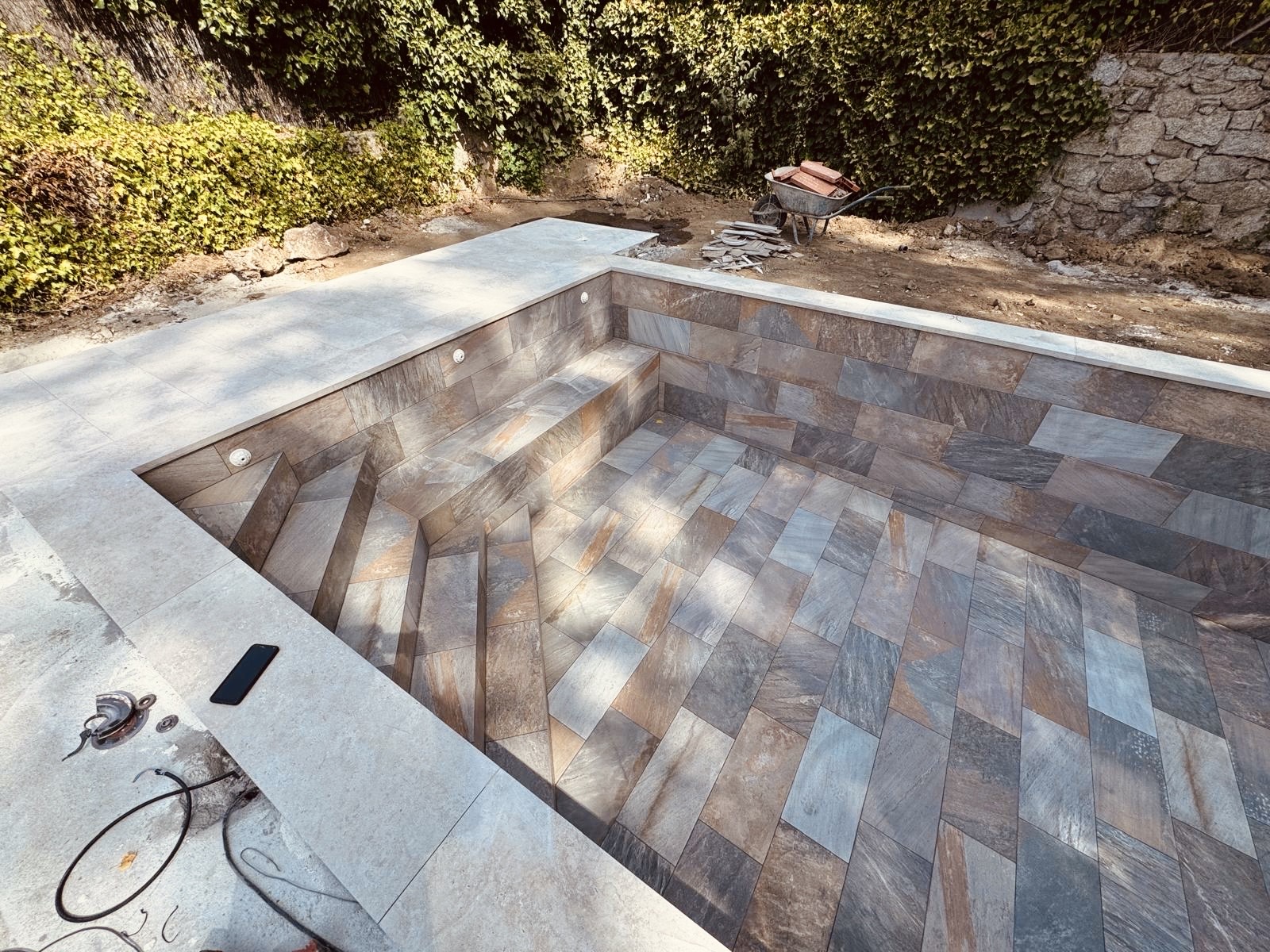 Se construyó una piscina de 7 x 3,5 metros con acabado en porcelánico Rosa Gres, incorporando escaleras y banco interior para mejorar la comodidad y el uso diario. El cliente puso especial atención en dos aspectos clave del proyecto: la calidad de la iluminación y la ejecución de las soleras de hormigón proyectado, que permitieron crear un espacio exterior funcional, sólido y perfectamente integrado con el jardín.