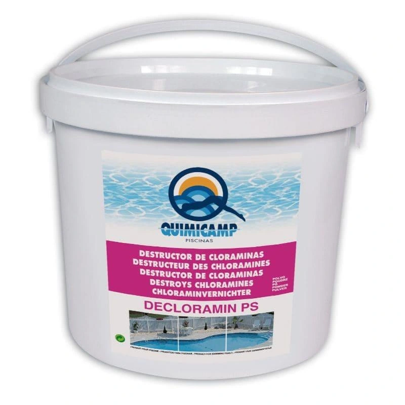 Utilice DECLORAMIN, es un destructor de las cloraminas(cloro combinado), que es el causante de ese olor a cloro tan característico y el escozor de mucosas y ojos.